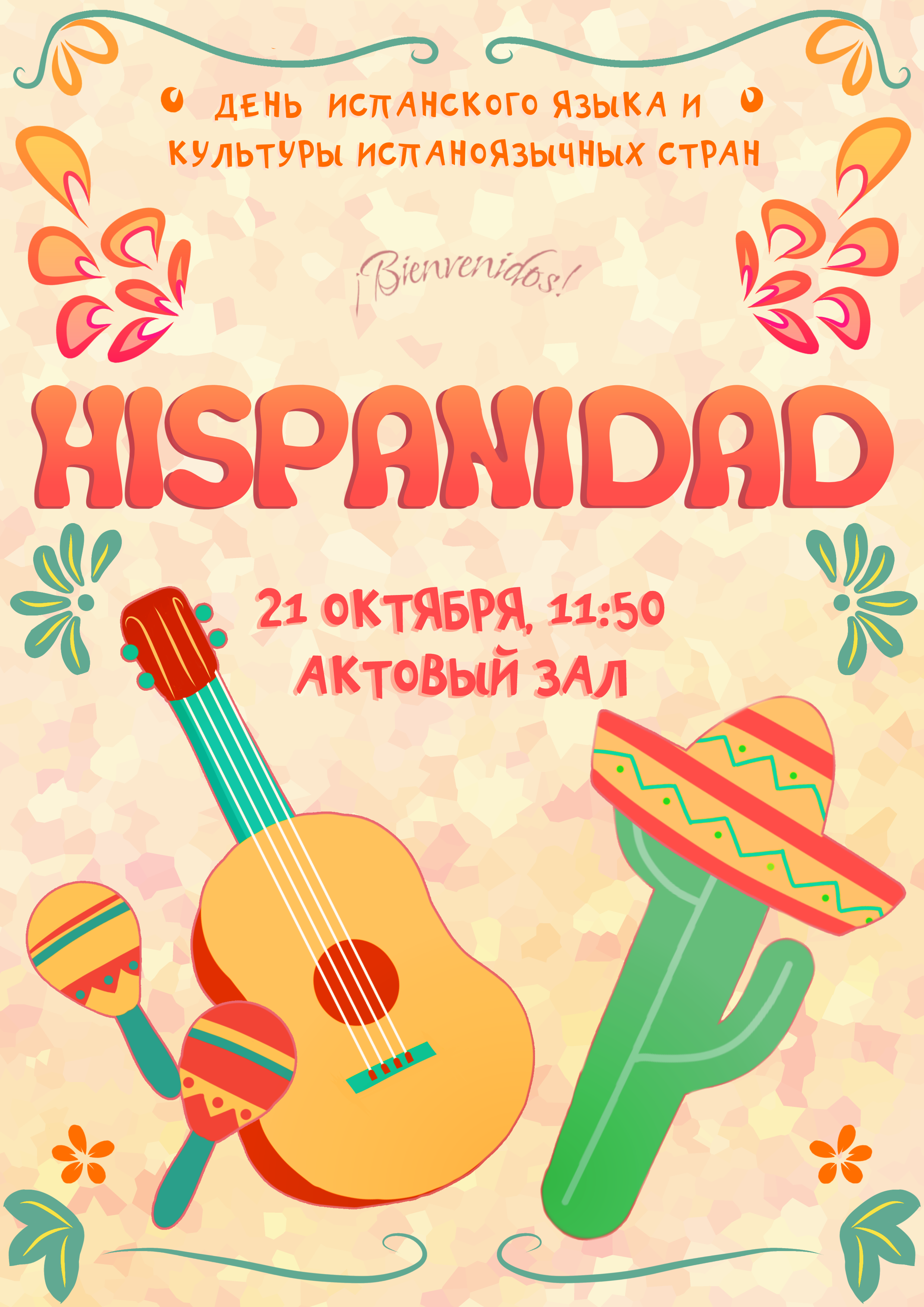 21 октября 2025 г. кафедра романо-германской филологии факультета иностранных языков ИФИЯМ ИГУ проводит мероприятие «Hispanidad - День испанского языка и культуры испаноговорящих стран». На празднике прозвучат стихи и песни на испанском языке. Зрители увидят зажигательные танцы, забавные сценки, а также узнают много интересного об Испании и странах Латинской Америки.